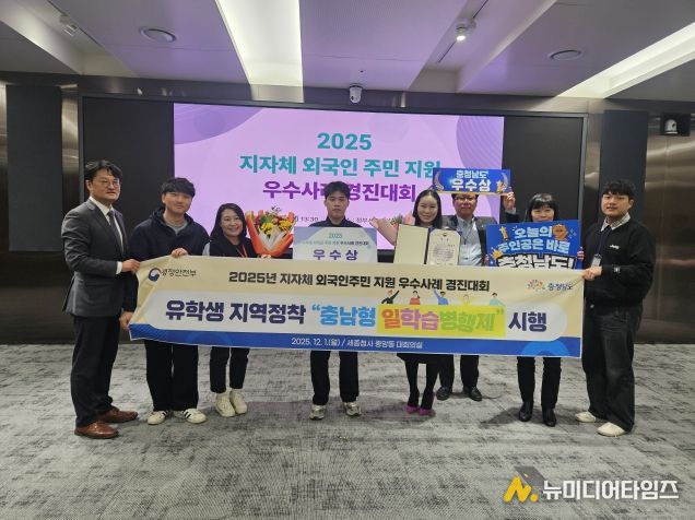 충남도는 지난 1일 정부세종청사에서 열린 행정안전부 주최 ‘2025 지자체 외국인 주민 지원 우수사례 경진대회’에서 ‘전국 최초, 유치부터 취업까지 책임지는 유학생 지역 정착 충남형 일학습병행제 시행’이라는 주제로 우수상을 수상했다고 3일 밝혔다.