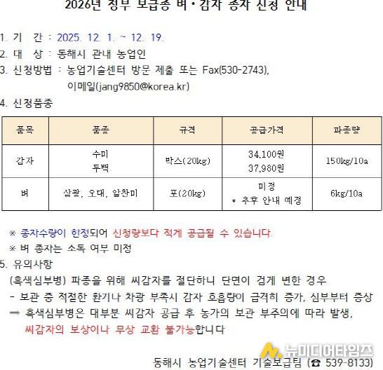 동해시는 2026년 농사를 준비하는 관내 농업인을 대상으로 정부 보급종 벼·감자 종자 신청을 받는다.