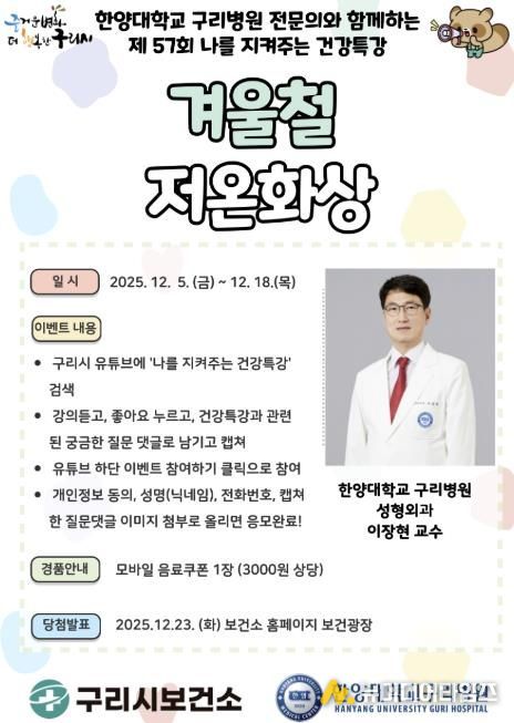 구리시는 겨울철을 맞아 시민들의 저온화상 예방을 위해 각별한 주의를 당부하고자, 오는 5일 한양대구리병원 성형외과 이장현 교수와 함께하는 ‘나를 지켜주는 건강특강’을 구리시 공식 유튜브 채널(구리비전)을 통해 송출한다고 밝혔다.