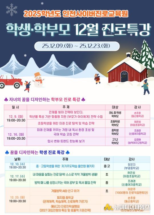 학생 대상 특강은 겨울방학을 성장 기회로 삼을 수 있도록 초등학생 ‘겨울방학 생활 계획’과 ‘AI와 친구하기’, 중학생 ‘국어 공부 및 독서 전략’과 ‘학습·진로 체력 기르기’, 예비 고3 ‘2027 대입 전형 분석’ 등 학년별 주제를 다룬다.