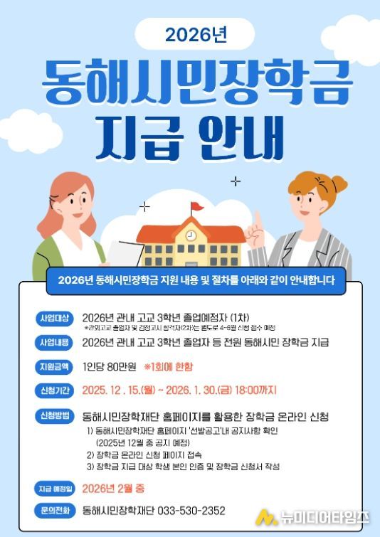 (재)동해시민장학재단은 지난달 개최한 제2차 이사회에서 2026년 관내 고교 졸업생 전원에게 1인당 80만 원의 장학금을 지급하기로 결정했다고 밝혔다.