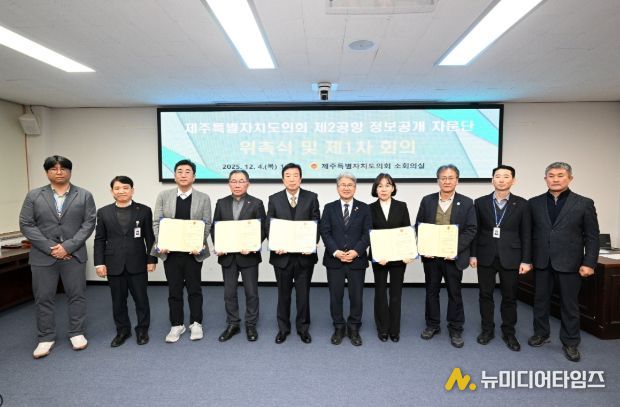제주특별자치도의회는 12월 4일 오후 2시 30분, 도의회 의사당 소회의실에서 '제주 제2공항 건설사업 정보공개 자문단' 위촉식을 개최하고 제1차 회의를 진행했다. 자문단은 제2공항 건설사업과 관련된 정보를 종합·정리하고, 도민에게 보다 정확하고 쉽게 전달될 수 있도록 조언하는 역할을 맡는다.