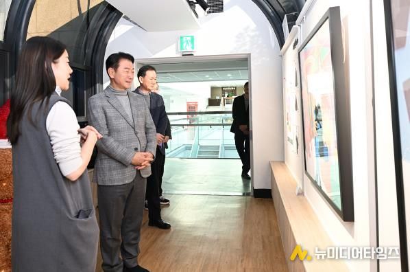 이날 김동근 시장은 본관 1층 로비에서 담은캘리그라피의 ‘영화 속 명대사(한글의 아름다움)’ 전시를 감상한 뒤, 연결통로로 이동해 ‘같이 걷는 발걸음’의 최소라 작가를 격려하고, 전시 공간 운영 방향에 대한 의견을 청취했다.