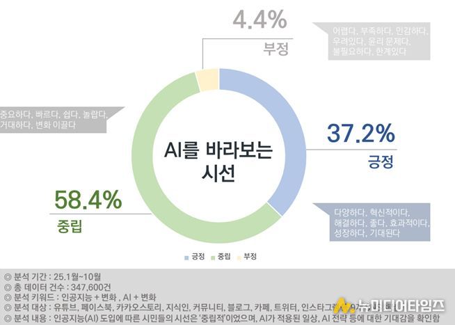 분석 결과, 시민의 AI에 대한 긍정 인식은 37.2%로 지난해(31.5%)보다 5.7%p 상승했다. 이는 기술 불안 중심의 담론이 ‘현실적 변화 수용’으로 이동하고 있음을 보여주는 지표다. AI가 이미 일상에 자리 잡고 있다는 현실을 인정하며, 그 변화 속에서 어떤 점을 활용하고 준비해야 하는지에 주목하는 흐름이 확산되고 있음을 의미한다.