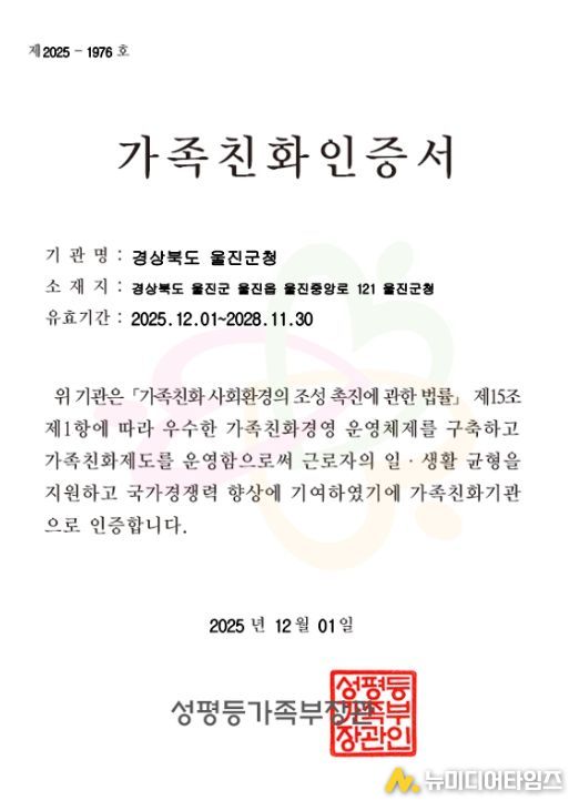 울진군은 성평등가족부가 주관하는 2025년 가족친화 인증 심사에서 우수한 평가를 받아‘가족친화 재인증’을 획득했다.