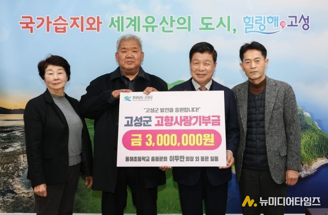 고성군은 12월 4일, 동해초등학교 이두만 회장과 동문들이 고향의 밝은 미래를 응원하는 뜻을 모아 고향사랑기부금 300만 원을 기탁했다고 밝혔다.