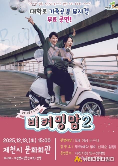 제천시는 인구문제에 대한 사회적 공감대를 형성하고 가족의 소중함을 되새기기 위한 ‘가족 뮤지컬 『비커밍맘2』’를 오는 12월 13일 오후 3시, 제천시 문화회관에서 개최한다. 이번 공연은 누구나 관람할 수 있는 무료 공연으로, 별도의 예약 없이 선착순 입장이 가능하다.