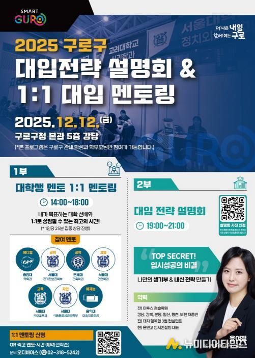 구로구는 이달 12일 구청 강당에서 대입을 준비하는 예비 수험생들을 위해 대입 전략 설명회와 일대일 상담(멘토링)을 운영한다.