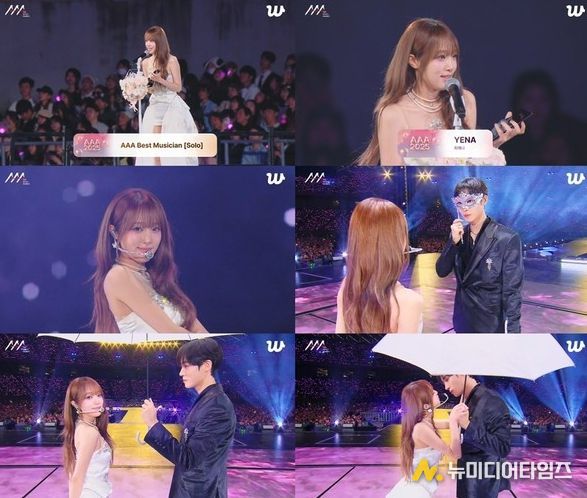 가수 최예나(YENA)가 'AAA' 베스트 뮤지션 상을 수상, 추영우와 설렘 퍼포먼스로 존재감을 드러냈다.