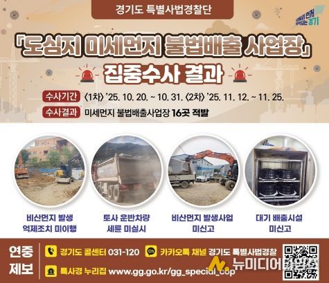 경기도는 도심지 미세먼지 발생사업장 330개를 대상으로 불법 배출 행위를 집중 수사해 대기환경보전법 위반 사업장 16개를 적발했다고 9일 밝혔다.