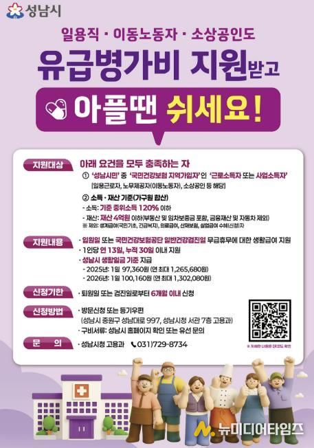성남시 관계자는 “우리 시는 불안정한 일거리와 소득으로 인해 아파도 쉬기 어려운 시민들의 생계와 건강권을 보호하기 위해 두텁고 촘촘한 노동취약계층 지원체계를 마련하고 있다”며 “더 늦기 전에 필요한 건강검진과 치료를 받고, 지원금 신청을 통해 ‘쉴 권리’도 적극적으로 보장받기를 바란다”고 말했다.