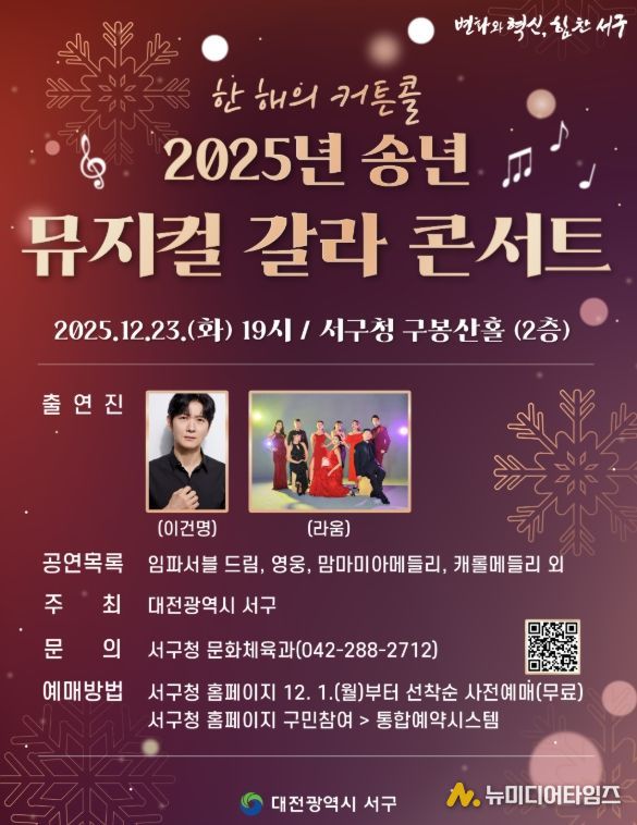 서구는 오는 12월 23일 구청 2층 구봉산홀에서 ‘2025년 송년 뮤지컬 갈라 콘서트’를 개최한다고 10일 전했다.