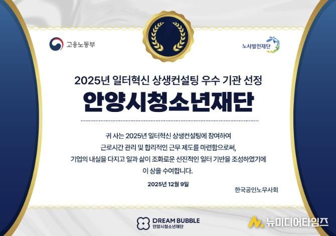 안양시청소년재단은 고용노동부가 주관한 2025년 일터혁신 상생컨설팅에 참여해 근로시간 관리 체계 개선과 합리적 근무제도 마련을 통해 우수 기관으로 선정됐다.