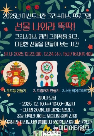 김포시 마산도서관은 오는 12월 23일과 24일 이틀에 거쳐 크리스마스를 기념한 체험프로그램 ‘선물 나와라 뚝딱!’이 진행된다.