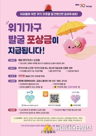 특히 김포시는 2025년부터 복지 위기가구 제보자에게 지급되는 발굴포상금을 5만 원으로 인상해 운영하고 있으며, 이를 통해 시민들의 관심과 참여를 높이고 실질적인 위기가구 발굴이 더욱 활성화될 수 있도록 지속적으로 노력하고 있다.