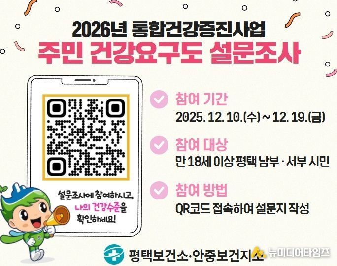 평택시 평택보건소는 10일부터 오는 19일까지 지역사회 주민 500명을 대상으로 2026년 통합건강증진사업 계획 수립을 위한 ‘주민 건강요구도 조사’를 시행 중이라고 밝혔다.