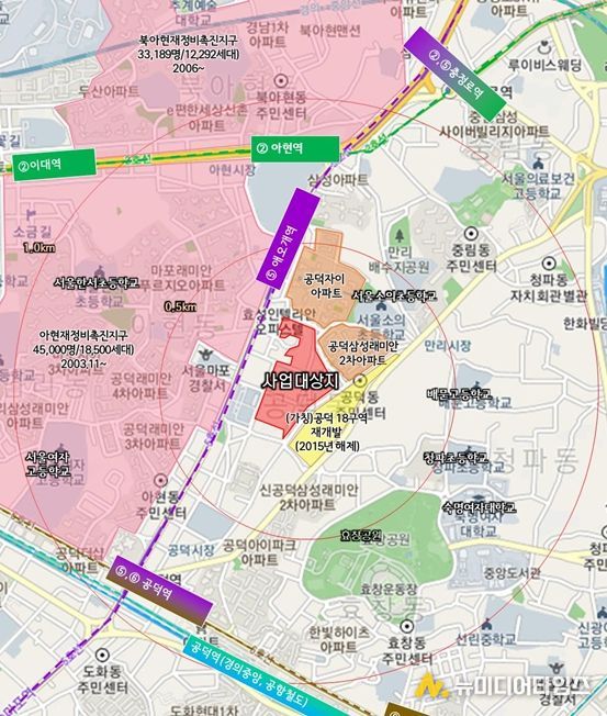 지난 2011년도에 구역 지정된 공덕1구역은 지난 2020년 도시계획위원회 심의 의견 사항을 반영하여 인접 필지 일부를 편입하고 공원 및 동주민센터 신설 등 기반시설 일부가 변경되어 구역 면적이 416㎡ 증가한다.