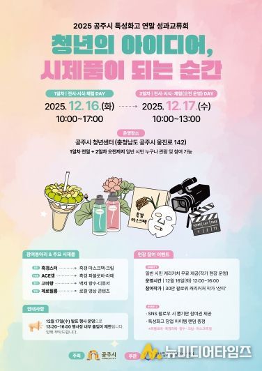 (재)충남창조경제혁신센터는'2025년 예비청년 특화사업 성장지원(교육특구 시범사업)'의 일환으로 추진 중인 특성화고 창업동아리 프로그램의 성과를 시민들과 공유하기 위해 ‘2025 특성화고 연말 성과교류회’를 12월 16일부터 17일까지 지역 청년센터에서 개최한다고 밝혔다.