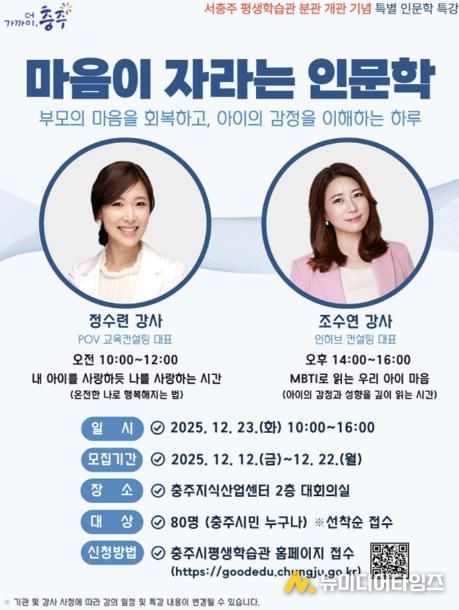 충주시는 서충주 평생학습관 분관 개관을 기념해 특별 인문학 특강 '마음이 자라는 인문학'을 오는 12월 23일 충주지식산업센터(주덕읍 화곡리1256-1)에서 개최한다고 밝혔다.