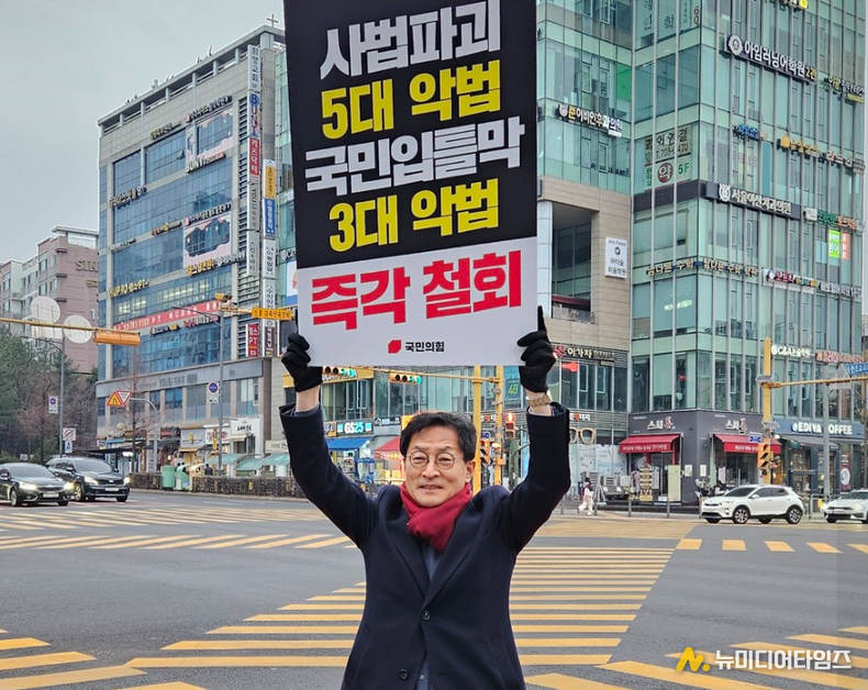 성남시의회 박종각 의원(국민의힘)이 "사법파괴 5대 악법, 국민입틀막 3대 악법 즉각 철회하라!"는 피켓을 들고 1인 시위에 나섰다.
