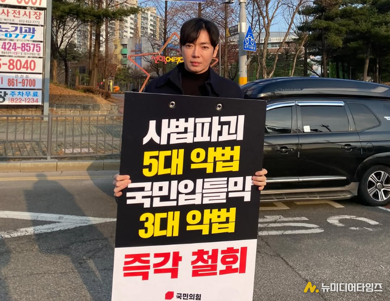 인천광역시의회 국민의힘 김용희 의원이 16일 선학사거리에서 더불어민주당이 추진 중인 '사법파괴 5대 악법'과 '국민입틀막 3대 악법' 저지를 위한 1인 시위를 전개했다.