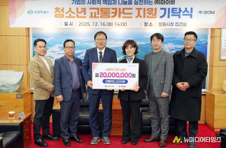 창원특례시는 16일 ㈜마이비가 사회공헌사업의 일환으로 저소득층 청소년의 교통비 부담 완화를 위해 교통카드 10만 원권 200장, 총 2,000만 원 상당을 기탁했다고 밝혔다.