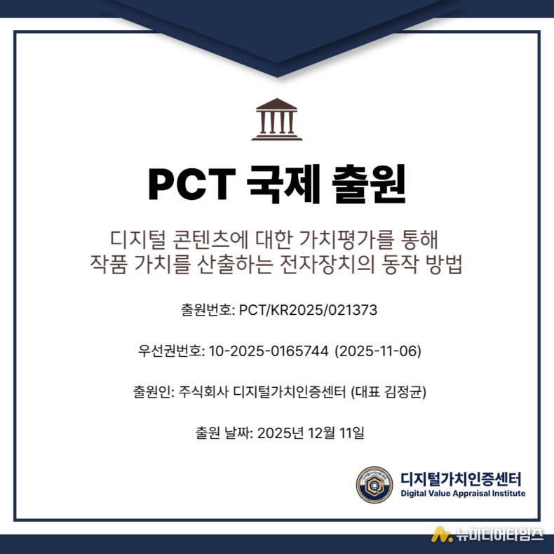 주식회사 디지털가치인증센터(대표 김정균)는 디지털 콘텐츠의 작품 가치를 보다 체계적으로 분석하기 위한 기술에 대해 PCT(특허협력조약) 국제출원을 완료했다고 밝혔다. 이번 출원은 국내 특허를 기반으로 해외 권리 확보 절차에 착수한 것으로, 디지털 콘텐츠 가치분석 기술의 국제적 활용 가능성을 염두에 둔 행보다.