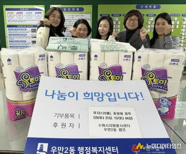 수원시 팔달구 우만2동은 지난 12일, 수원시자원봉사센터 우만2동 캠프로부터 휴지와 종량제 봉투 기부를 전달받는 뜻깊은 시간을 가졌다.