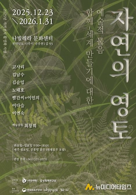 17일 나주문화재단(이사장 윤병태)에 따르면 문화체육관광부와 예술경영지원센터가 주관한 ‘2025년 지역전시 활성화 사업 유형3 미술콘텐츠-전시공간 매칭 지원’ 공모에 선정돼 전시 ‘자연의 영토 함께-세계만들기에 대한 예술적 물음’을 오는 12월 23일부터 2026년 1월 31일까지 나빌레라문화센터에서 개최한다.