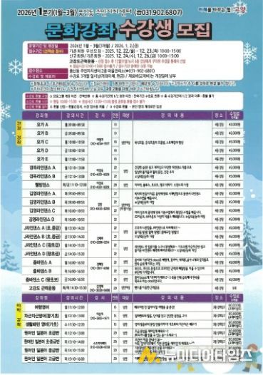 고양특례시 일산동구 풍산동 주민자치회가 오는 22일부터 2026년 1분기 주민자치센터 문화강좌 수강생을 모집한다고 밝혔다.