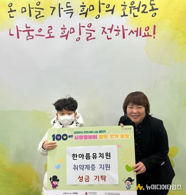 의정부시 호원2동주민센터는 12월 16일 한아름유치원 원생들이 고사리손으로 정성껏 모은 성금 37만 원을 전달하며 ‘100일간 사랑릴레이 배턴 잇기’에 동참했다고 밝혔다.
