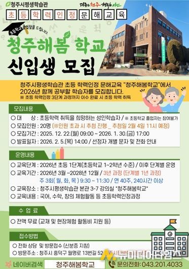 청주시는 초등학력 취득을 희망하는 성인 학습자를 위한 학력 인정 문해교육 프로그램 ‘청주해봄학교’의 2026학년도 신입생을 모집한다고 20일 밝혔다.