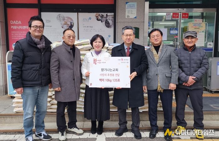 시흥시 계수동에 있는 향기나는교회가 지난 12월 19일 대야동 마을자치과에 백미 10kg 135포를 전달하며 지역 내 취약계층을 위한 따뜻한 나눔을 실천했다.