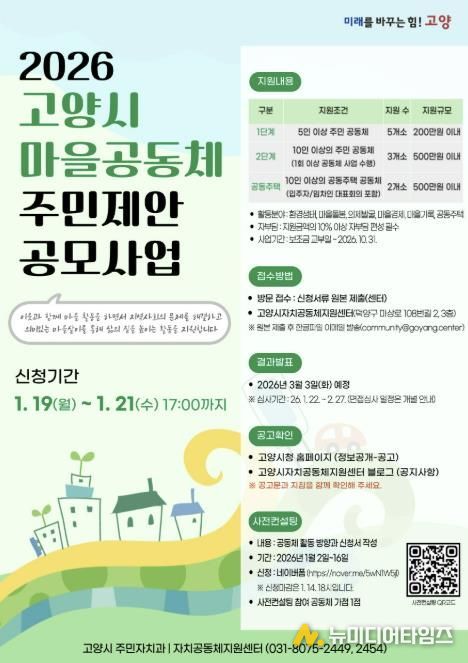 고양시 관계자는 “이번 공모사업이 주민 주도의 마을공동체 활동을 확산하고 지역 문제 해결 역량을 높이는 계기가 되길 바란다”며 “마을공동체가 이웃과 함께 지역의 의제를 발굴하고 지속 가능한 변화를 만들어 가는 주체로 자리 잡을 수 있도록 많은 시민과 공동체가 적극적으로 참여하길 바란다”고 말했다.