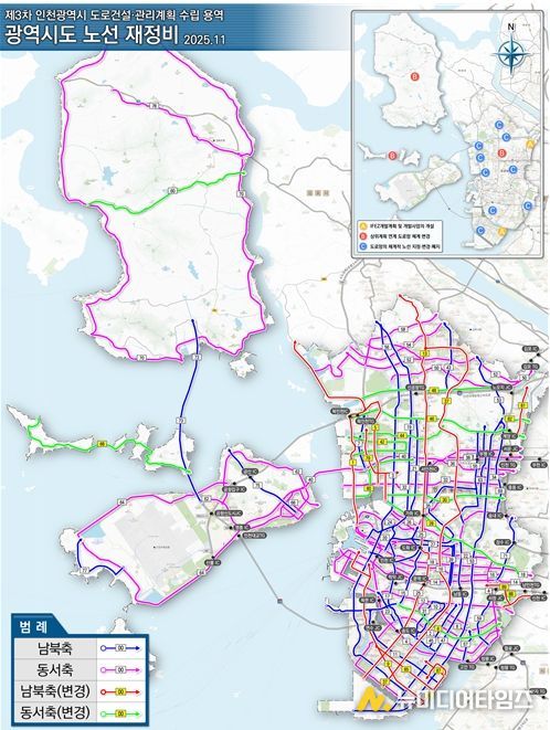 인천광역시는 12월 22일 송도·청라경제자유구역 및 계양 테크노밸리(TV) 개발계획, 고속도로 건설 및 교통혼잡도로 개선사업계획 등 국가 상위계획을 반영해 광역시도 노선 체계를 재정비하여 고시한다고 밝혔다.
