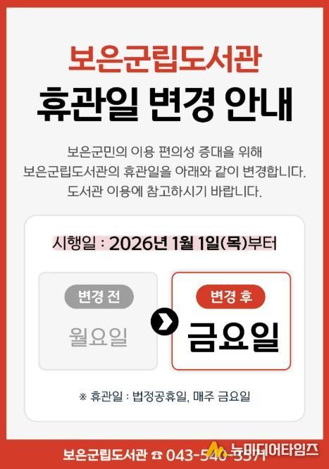 보은군립도서관은 2026년 1월부터 정기휴관일을 기존 매주 월요일에서 금요일로 변경해 운영한다고 밝혔다.