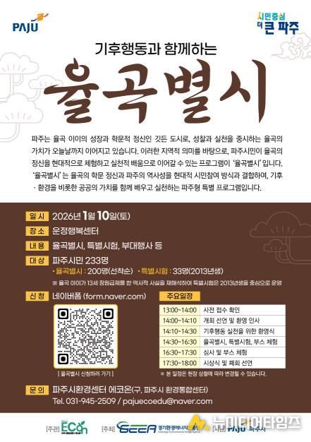 파주시환경센터 ‘에코온’은 파주를 대표하는 조선시대 사상가 율곡 이이의 학문 정신을 현대적 기후행동 가치로 재해석한 기후문화축제 ‘기후행동과 함께하는 율곡별시’를 오는 내년 1월 10일 운정행복센터에서 개최한다.