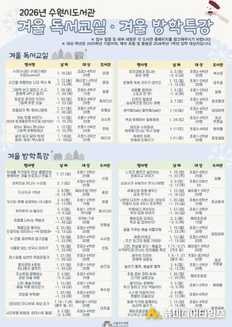 수원시도서관 관계자는 “겨울방학 동안 아이들이 책과 가까워지고 다양한 경험을 쌓을 수 있도록 프로그램을 준비했다”며 “도서관이 배움과 휴식이 공존하는 공간이 되길 바란다”고 말했다.