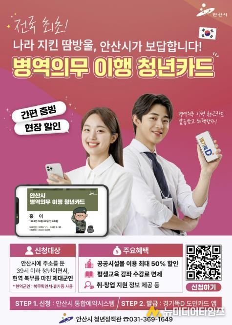 안산시는 내년 1월부터 병역의무를 성실히 이행한 청년을 예우, 지원하기 위해 전국 최초로 ‘병역의무 이행 청년카드’를 온라인으로 발급한다고 22일 밝혔다.