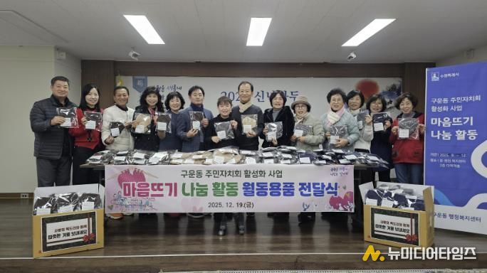 지난 19일, 권선구 구운동 주민자치회가 주민자치회 활성화 사업 일환으로 추진한 ‘마음 뜨기 나눔 활동’을 통해 만든 목도리 400여 개를 구운동 행정복지센터에 전달했다.