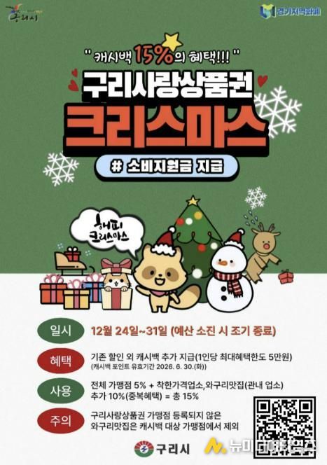 구리시는 12월 24일부터 ‘구리사랑상품권 크리스마스 소비 지원금’을 지급한다고 밝혔다. 이번 소비 지원금은 연말연시 기간 지역 외로 유출되는 소비를 지역 내로 유도하고, 관내 상권 활성화와 소상공인 보호를 위해 마련됐으며, 예산 소진 시 조기 종료될 수 있다.