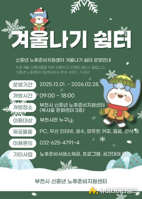 이소영 부천시 돌봄지원과장은 “겨울나기 쉼터는 시민들이 추위를 피해 따뜻하게 머물며 이웃과 자연스럽게 마주하고 소통할 수 있는 공간”이라며 “쉼터 이용이 노후준비 상담과 교육 등 다양한 서비스로 이어질 수 있도록 운영해 나가겠다”고 말했다.