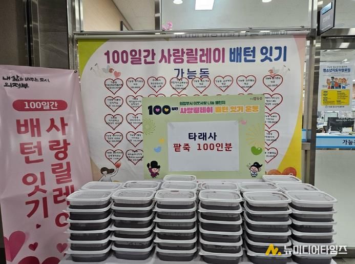 의정부시 가능동주민센터는 12월 19일 한국불교태고종 타래사가 동지를 맞아 팥죽 100그릇을 기탁하며 ‘100일간 사랑릴레이 배턴 잇기’에 동참했다고 밝혔다.