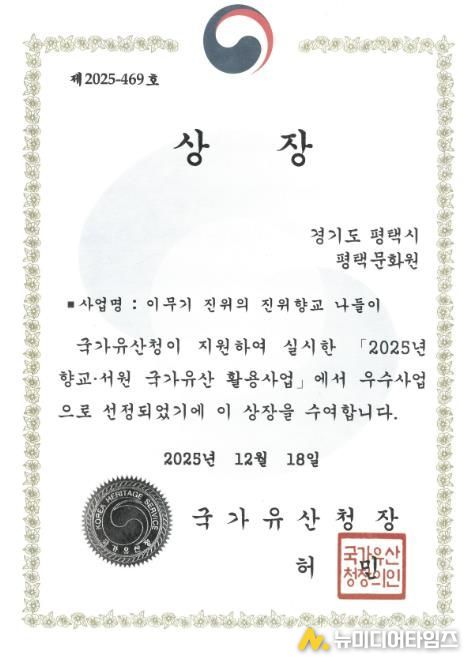평택문화원은 12월 18일 대전 전통나래관 다목적강당에서 열린 국가유산청 주최 ‘2025 우리고장 국가유산 활용 우수사업 시상식’에서 평택문화원의 ‘이무기 진위의 진위향교 나들이’가 우수사업(국가유산청장상)으로 수상했다.