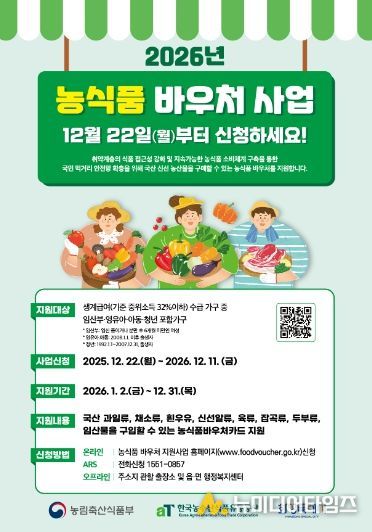 신태식 농식품유통과장은 “이번 농식품 바우처 지원사업을 통해 저소득 취약계층의 건강한 식생활을 돕고 지역 농산물 소비를 촉진하는 데 기여할 수 있을 것으로 기대한다”며 “사업이 원활하게 진행될 수 있도록 철저히 준비하겠다”고 말했다.