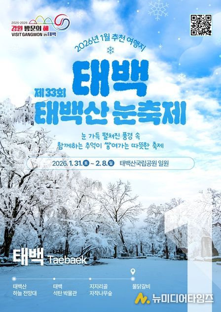 강원특별자치도와 강원관광재단은 ‘2026 강원 방문의 해’ 1월 추천 여행지로 태백시와 홍천군을 선정하여 대대적인 홍보마케팅을 추진한다고 밝혔다.
