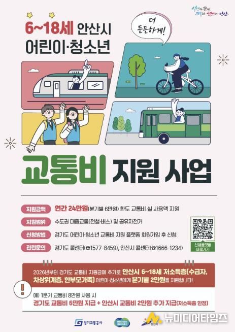 이민근 안산시장은 “어린이와 청소년이 교통비 부담 없이 안전하고 편리하게 통학·이동할 수 있는 환경을 조성하기 위해 마련된 정책인 만큼, 지원 대상을 점진적으로 확대해 나가겠다”고 말했다.