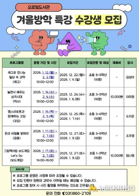 동두천시 도서문화사업소 오르빛도서관은 겨울방학을 맞아 관내 초등학생이 다양한 주제를 흥미롭게 체험하며 사고력과 표현력을 키울 수 있는 겨울방학 특강 프로그램을 운영한다고 밝혔다.
