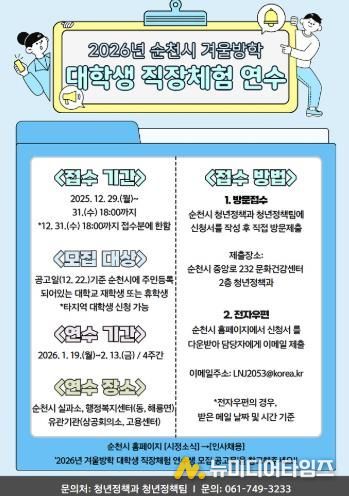 순천시는 겨울방학을 맞아 대학생들에게 행정 현장 경험의 기회를 제공하기 위해 ‘2026년 겨울방학 대학생 직장체험 연수생’을 모집한다고 밝혔다.