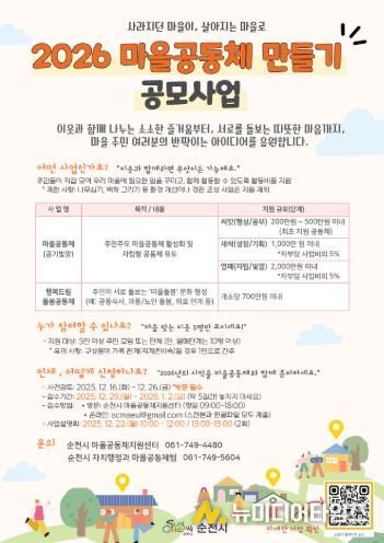순천시는 주민이 주도하는 마을공동체 활동을 활성화하고, 이웃돌봄을 기반으로 한 지역 안전망을 강화하기 위해 2026년 '마을공동체 만들기 공모사업' 참여 공동체를 모집한다.